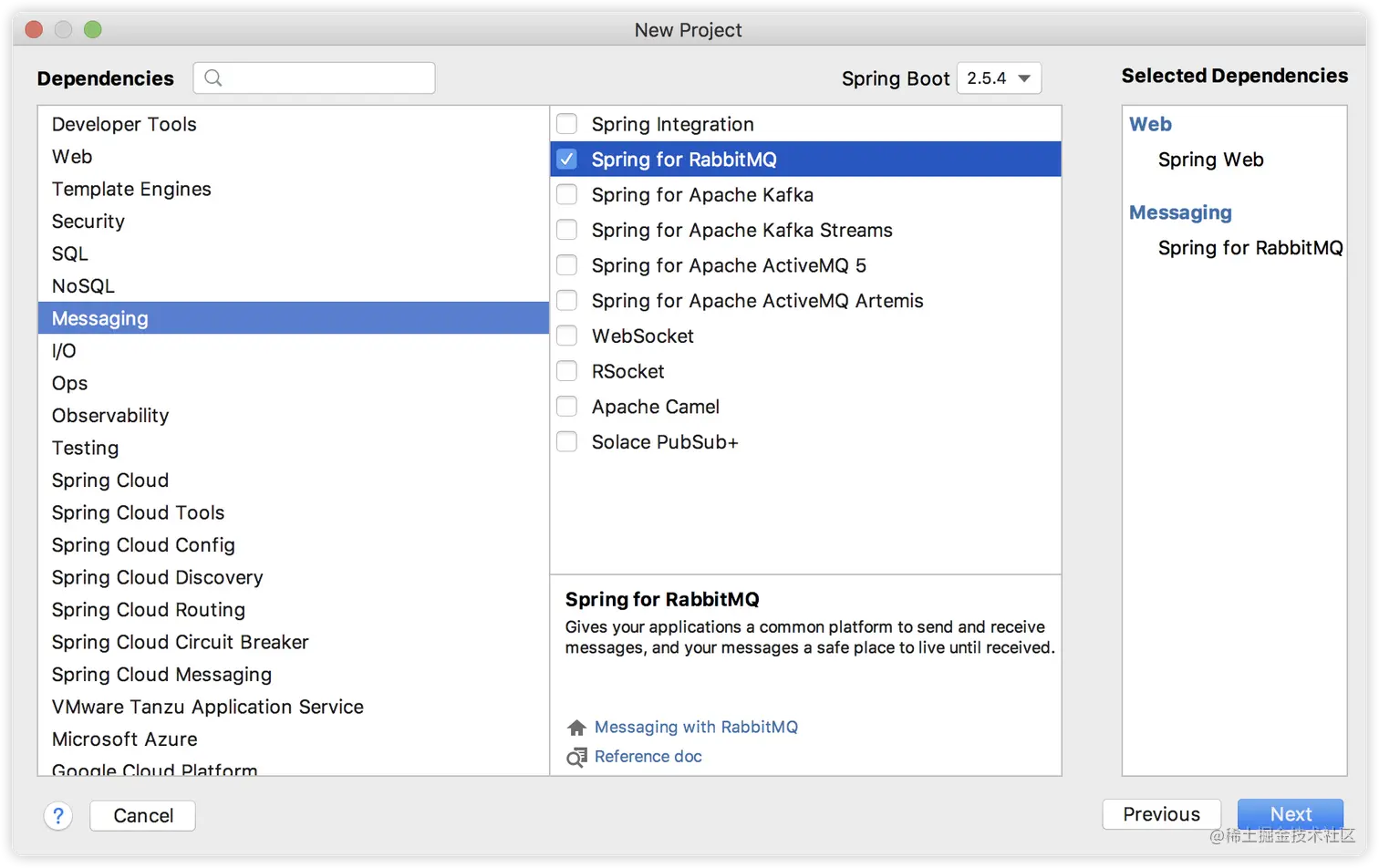 首先创建一个 Spring Boot 项目,引入 Web 和 RabbitMQ 依赖,如下:
