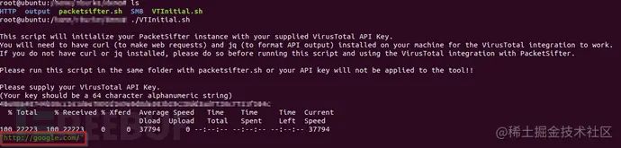 现在,切换到项目根目录下,并运行VTInitial.sh,然后提供你的VirusTotal API密钥(64位)。关于如何获取免费的VirusTotal API密钥,可以参考这篇【文档】。