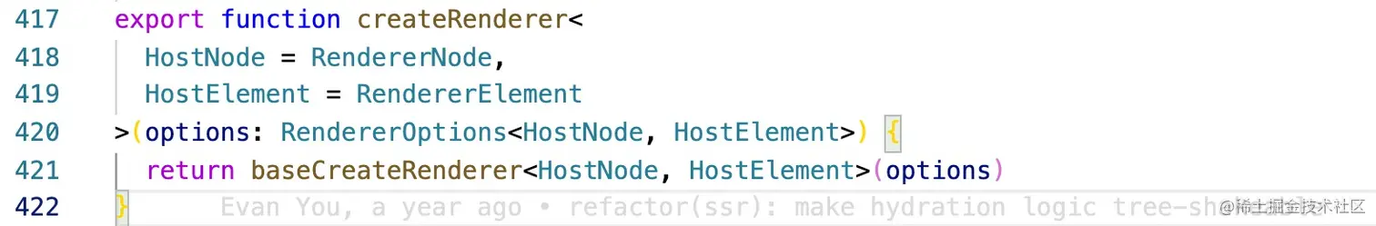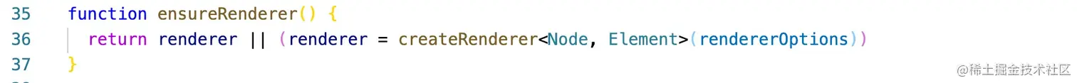 ensureRenderer方法会看这个renderer有没有创建,如果创建直接返回,没有的话就调用createRenderer这个方法去创建renderer。这个renderer就是实例真正的创建者。所以又要去renderer.ts看createRenderer()这个方法了