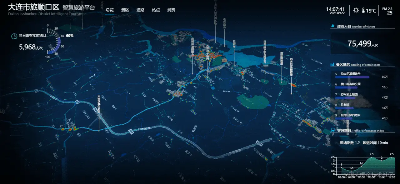 答:来吧,一起看图好了,下面是ThingJS平台的大连市旅顺口智慧旅游平台。