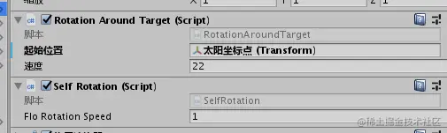 并且每个都挂载上两个脚本【RotationAroundTarget】和【SelfRotation】