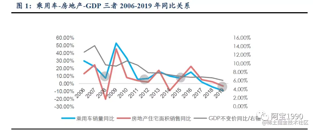 好了,我们来看看车辆和GDP、房子三者的增速关系,从2006-2019年三者整体周期轮回是同步的,一轮周期长度约3-4年。2008年,2012年,2015年均是乘用车历史上周期交替的时间点。2005-2008年受宏观经济高增长带来乘用车首次购车需求陡增。2009-2012年受4万亿财政政策+汽车下乡政策+购置税补贴政策导致2009-2010年透支了2011-2012年需求引起了周期性变化。