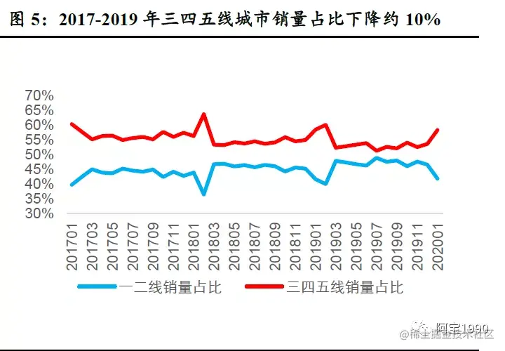 三四五线城市销量占比从2017年初60%持续下降至2019年Q3的52%附近,2019/7-2020/1已企稳回升,为什么说三四五线城市占有量企稳了,对于整个销量就回暖了,你看看上面售价的分布数据就知道了。