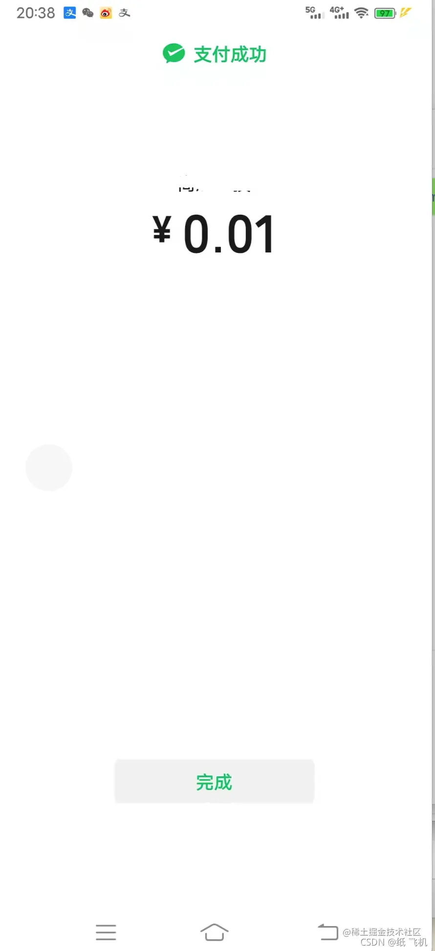 当支付完成后,到了该界面,无论是返回,还是点完成,他都直接关闭了页面,无论在支付成功回调里做啥,都无效(无论是alert,还是页面跳转等)。支付失败和取消支付的回调都正常。