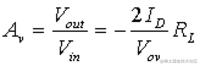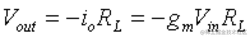输入电压V在(V是对于BJT和v GS为MOS)倍跨导克米等于小信号输出电流i Ó在集电极或漏极。V out将只是这个电流乘以负载电阻 R L ,暂时忽略小信号输出电阻 r o。由于电流 i o的方向,请注意减号。