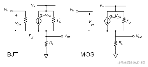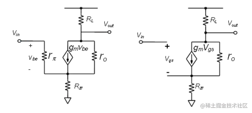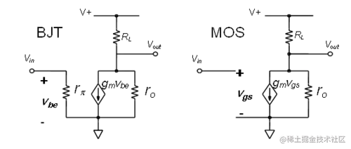 与共发射极/源极放大器级非常相似,小信号输入电压V in(v是BJT,v gs是 MOS)乘以跨导g m等于小信号输出电流 i o在集电极或排水。V out将只是这个电流乘以负载电阻 R L ,暂时忽略小信号输出电阻 r o。