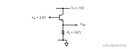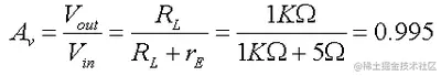 要使用这个公式,我们需要知道 I E。我们知道 R L两端的电压是V out。我们也知道V out = V in - V BE。如果我们使用V BE的估计值为0.6 伏,我们得到V out = 5.6 - 0.6 或 5 伏。如果 R L为 1KΩ,则 I E为 5mA。使用V T = 25mV的室温值,我们得到 r E等于 5Ω。将这些值代入我们的增益方程,我们得到: