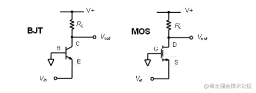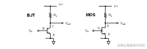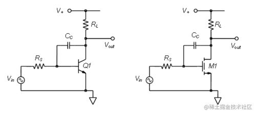 共发射极/源极放大器是三种基本的单级放大器拓扑结构之一。BJT 和 MOS 版本用作反相电压放大器,如图 9.2 所示。晶体管的基极或栅极端子用作输入,集电极或漏极为输出,发射极或源极为输入和输出共用(它可能与地参考或电源轨相连),即产生了它的通用名称。