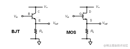 电压跟随器的增益总是小于 1,因为 r E和 R L或 r S和 R L形成分压器。输入到输出偏移由比 BJT 和V GS的基准低约 0.65 伏的V BE压降设置在 MOS 门的下方。此配置的功能不是电压增益,而是电流或功率增益和阻抗匹配。输入阻抗远高于其输出阻抗,因此信号源不必为输入提供尽可能多的功率。这可以从基极电流比发射极电流小 100 倍 (β) 的数量级看出。射极跟随器的低输出阻抗匹配低阻抗负载并缓冲来自该低阻抗的信号源。