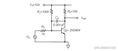 在本例中,我们将使用图 9.7.5 所示的电路来说明反馈电容器 C C的米勒乘法。偏压电阻器 R 1和 R S被选择来设置直流工作点,使得V out处于大约V +/2 或 5V的直流值。对于10KΩ的给定 R L,低频小信号电压增益 A V约为 80。