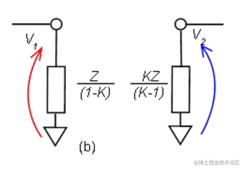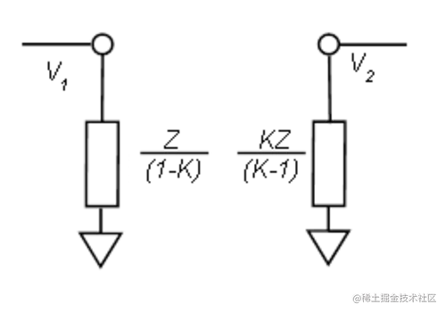 在这一点上,我们将转移话题来讨论米勒定理。虽然到目前为止我们一直使用的方法是完全通用的,但有一些配置可以通过米勒定理更简单地进行分析。米勒定理指出,在线性电路中,如果存在阻抗为 Z 的支路连接节点电压为V 1和V 2 的两个节点,则该支路可以被其他两个支路替换,分别通过阻抗 Z 将相应节点连接到地/ (1- K ) 和 KZ / ( K -1),其中从节点 1 到节点 2 的增益为K = V 2 / V 1。