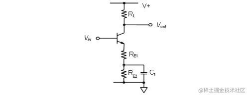 阻抗 R E将电路的总跨导g m降低了g m R E + 1倍,这使得电压增益: