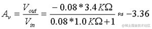 回到我们之前的偏置示例,图 9.5.1,I C = 2mA、R L = 3.4KΩ 和 R E = 3KΩ 的值来计算我们首先发现的小信号增益g m = I C / V T = 2mA/ 25mV = 0.08。使用我们的 A V公式: