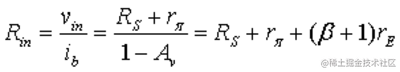 如果我们假设输入源 Vin 是交流耦合的并且没有直流偏置电流流入 R S,根据基尔霍夫电压定律,基极电阻 R F两端的电压V RF为:
