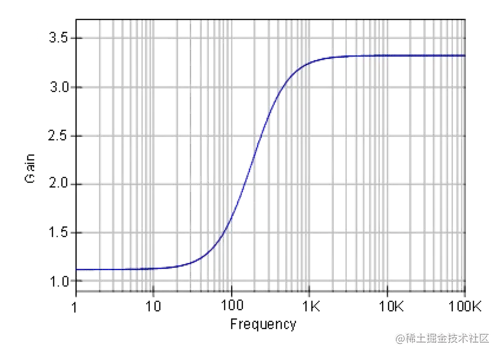 对于 R E1 = 1K 、R E2 = 2K 和 C 1 = 1uF的示例问题,我们得到零的频率等于 80 Hz,极点的频率等于 237 Hz。示例电路从 1 Hz 到 100 KHz 的模拟频率响应如图 9.5.5 所示。