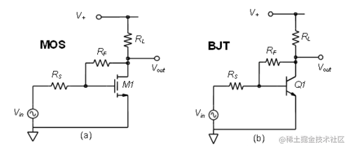 图 9.7.1 Drain-to-Gate (a) 和 Collector-to-Base (b) 分流反馈