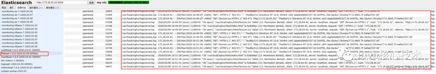 可以看到nginx中的access.log和error.log的日志都已经上来了。在kibana中通过filebeat-*过滤看filebeat的索引,可以看到通过filebeat采过来的数据。