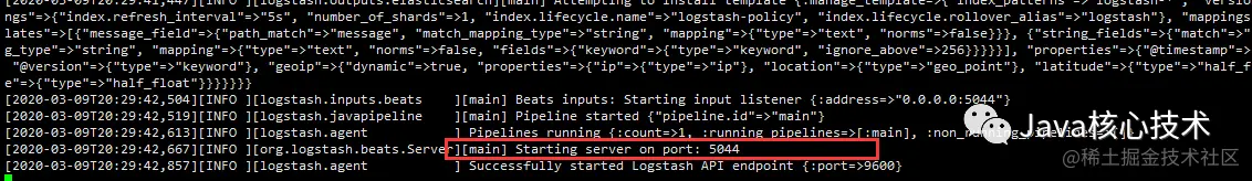启动以后可以看到logstash的启动日志5044端口的服务已经起了,可以接受通过filebeat通过5044端口传过来的数据了。