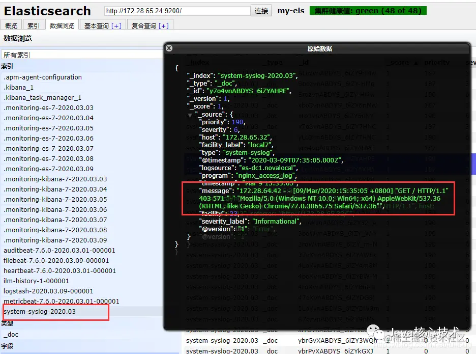 同样通过Elasticsearch-head在ES 中也可以看到有相应的日志数据