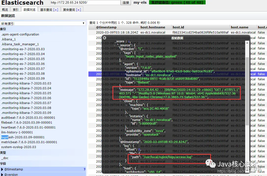 我们访问nginx服务提供的web服务http://172.28.65.32/ 在logstash的控制台 可以看到同样的效果。