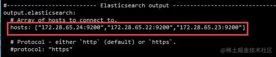 输出到es中,在hosts中配置好你的ES服务地址。如果单机只有一个节点,就可以只配一个ip和端口。