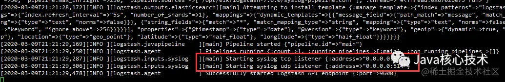 input配置表示通过514端口接收syslog的数据 output配置表示输出到elasticsearch,并且同时输出到标准输出也就是控制台。通过执行 bin/logstash -f syslog-pipeline.conf --config.reload.automatic 启动logstash