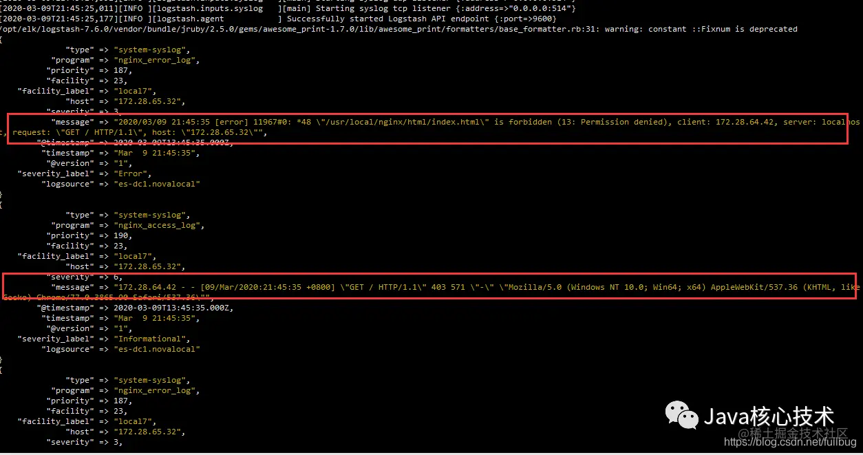可以看到logstash启动以后开启了514端口的tcp和upd协议的侦听。我们访问nginx服务提供的web服务http://172.28.65.32/ 在logstash的控制台 可以看到相应的nginx访问access和error的日志