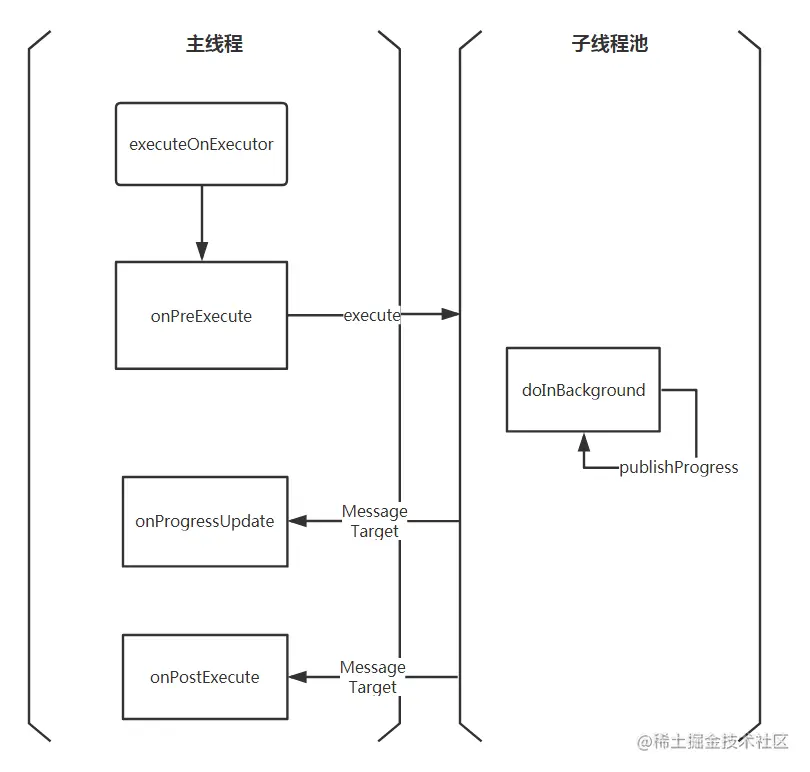 由图可见,AsyncTask为Android开发者提供了一种便捷的主线程和子线程通信的解决方案——将耗时、易阻塞的事务放在子线程中处理,将子线程处理的结果通过Message传递给主线程的Handler处理。