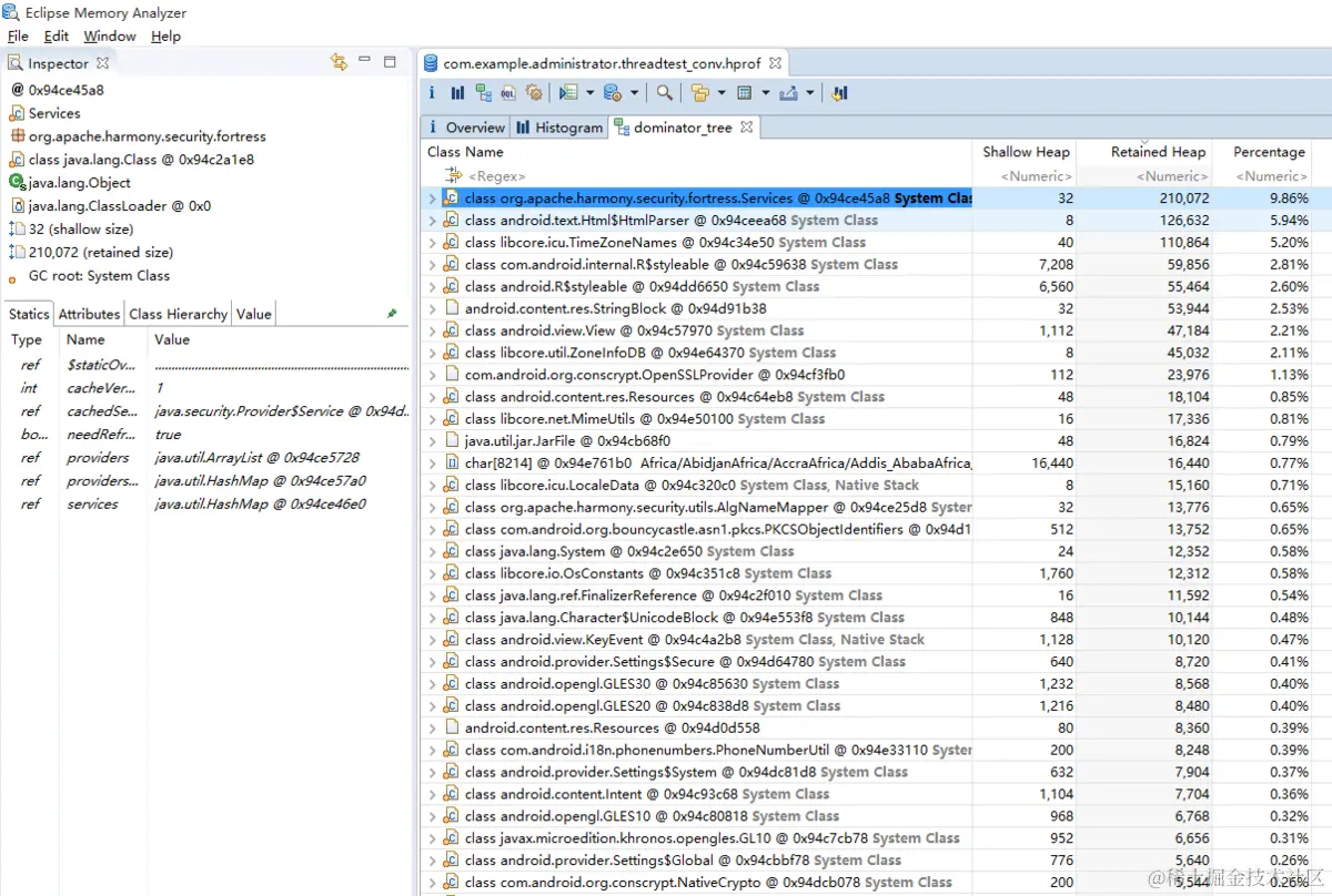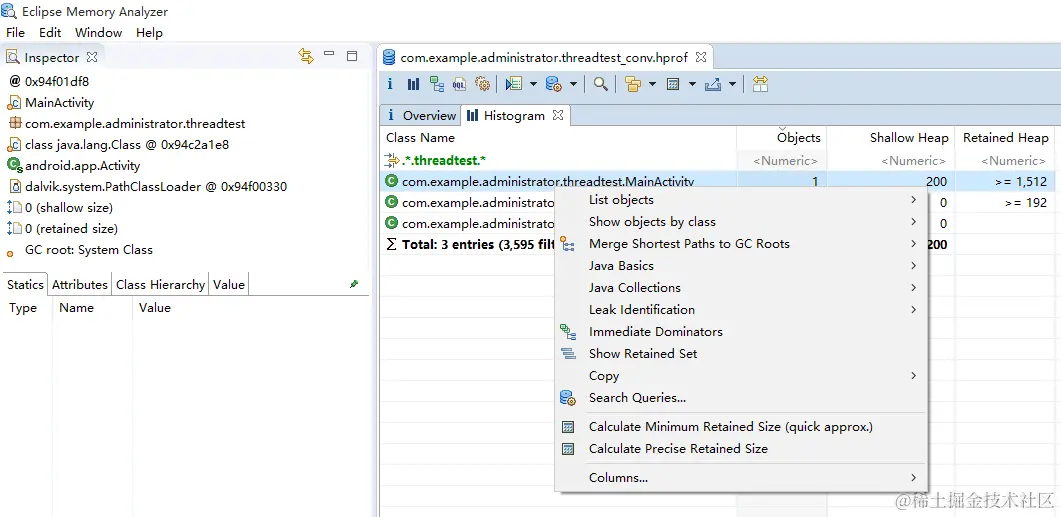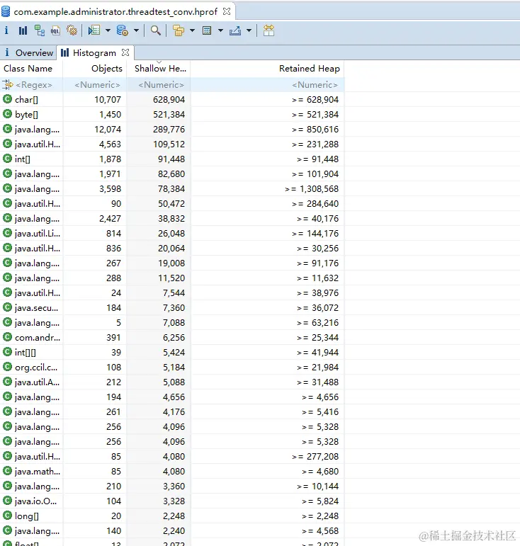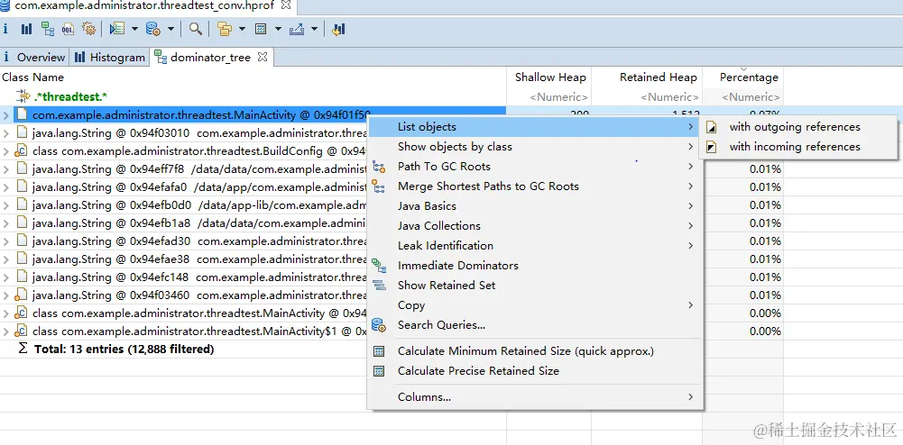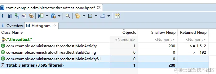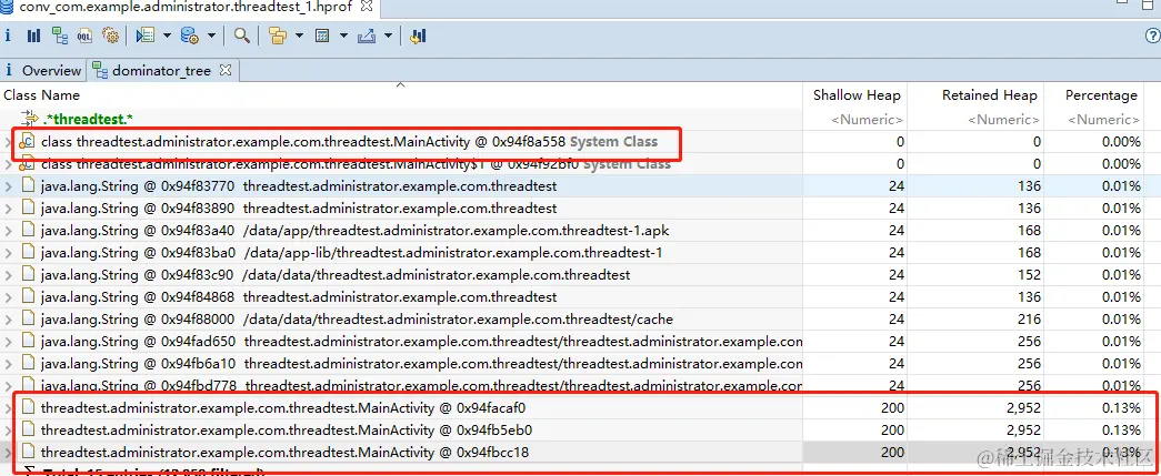 通过MAT分析对应的hprof文件,如下图(通过正则匹配了threadtest):