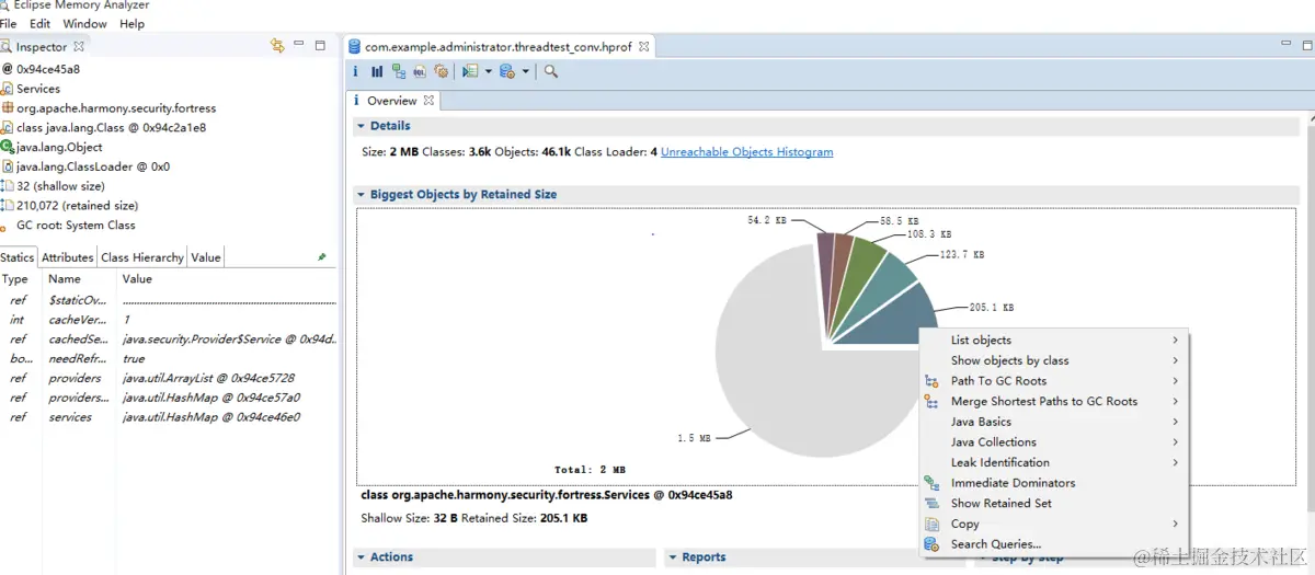 用MAT打开一个hprof文件后会进入如下的overview界面,或者和这个界面类似的leak suspect界面,overview界面会以饼图的方式显示当前消耗内存最多的几类对象,可以使我们对当前内存消耗有一个直观的印象。
