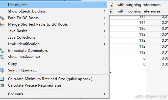 List objects -> with outcoming references:查看这个对象被哪些外部对象引用(别人的成员变量)