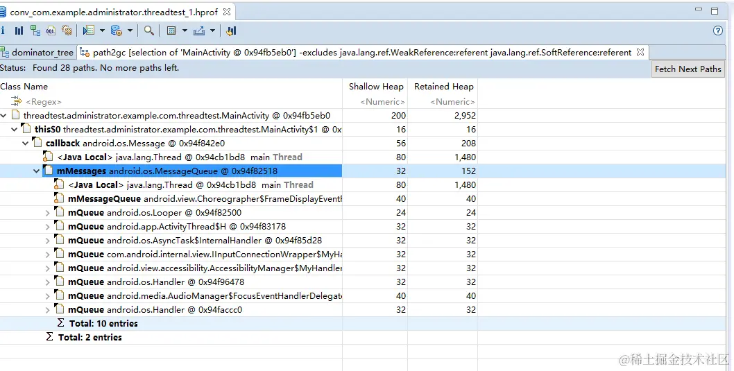 如图我们会发现了有四个MainActivity对象,此时我分别对这四个MainActivity实例进行exclude weak/soft references分析,我们就会发现以下图:
