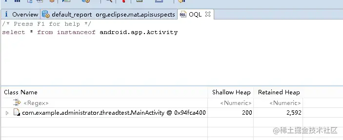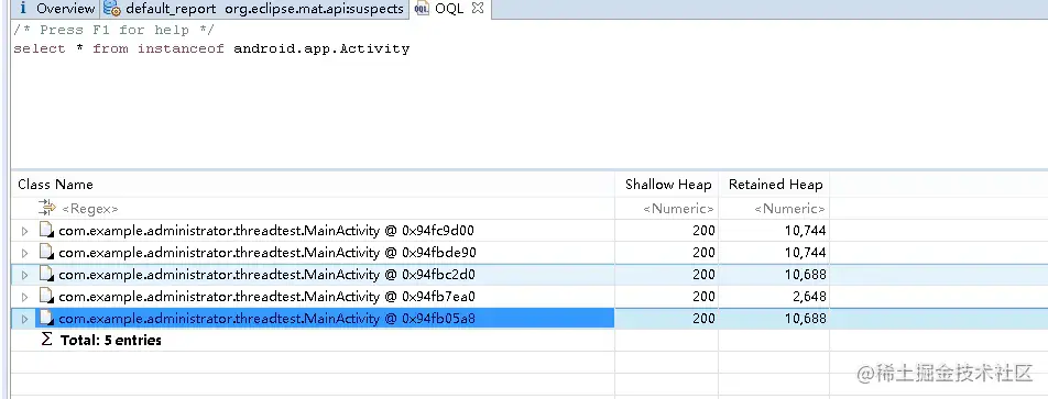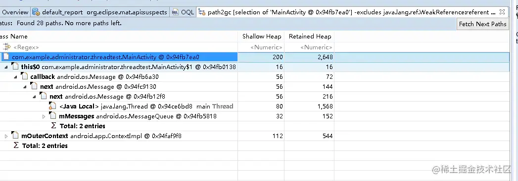 可以看出MainActivity创建了多份实例(此图使用了MAT中的OQL,以后的章节会详细的讲解),我们的预期是只能有一个这样的MainActivity实例。将其中某个对象实例引用路径列出来,见下图。