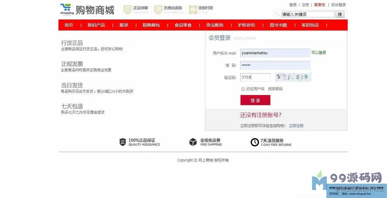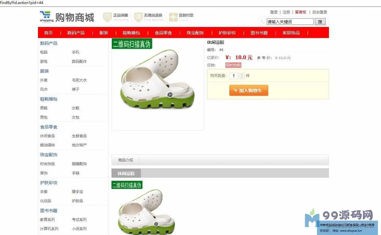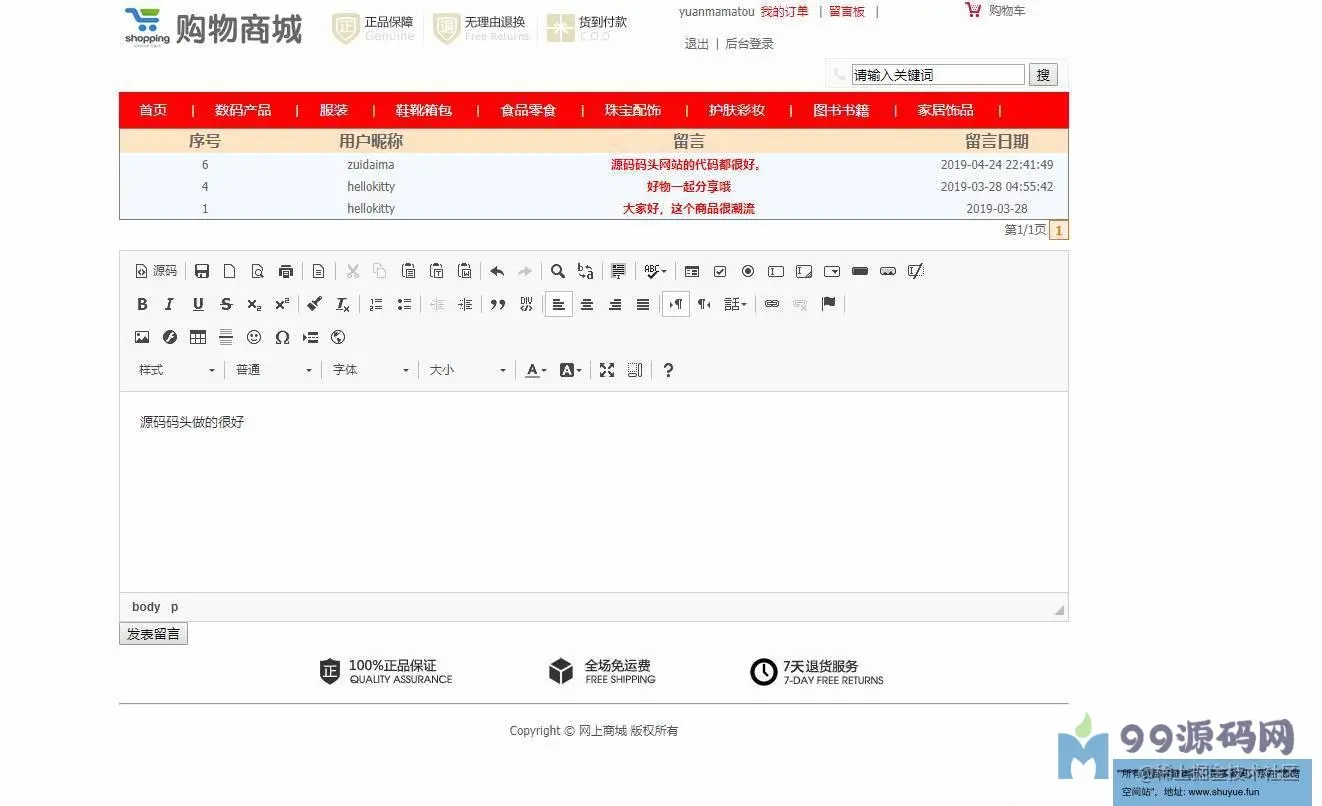 用户首页,查看商品,用户注册,用户登录,参加购物车,提交订单,查看我的订单,留言板留言等功用。