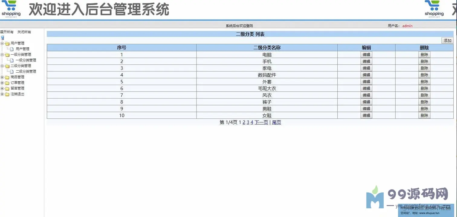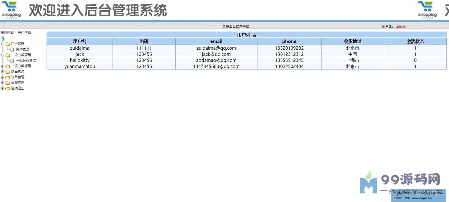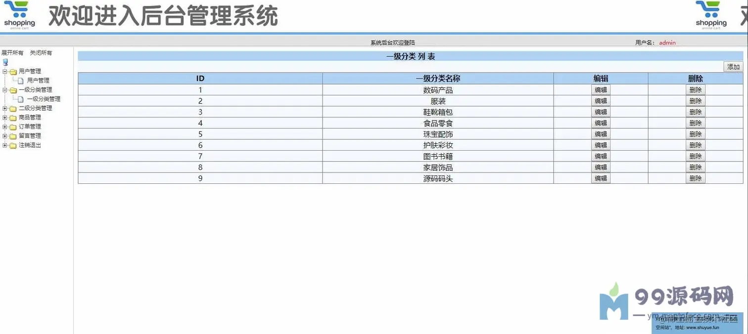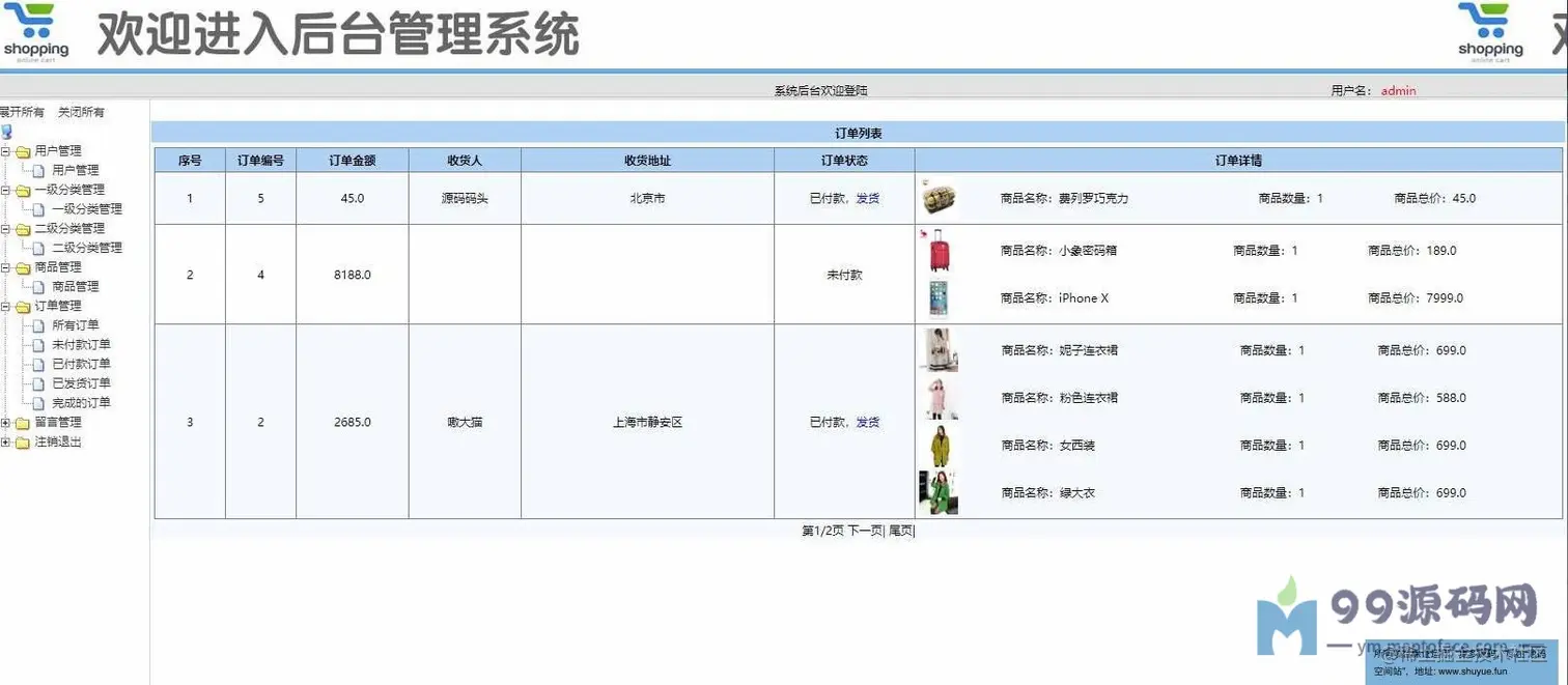 登录页面,用户查看,一级分类管理,二级分类管理,商品管理,查看订单,留言管理等功用。