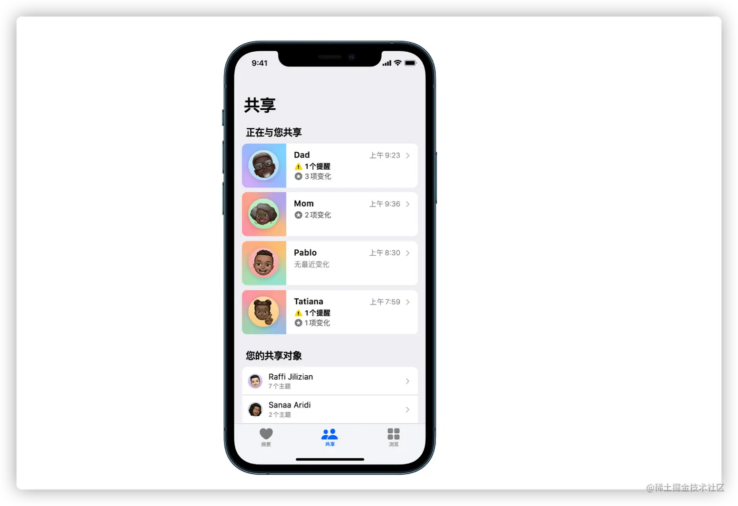 健康 与亲友共享健康数据、查看“步行稳定性”分析以评估摔倒风险,以及通过“趋势”了解健康状况随时间的变化。请参阅与您亲近的人共享健康数据、监控步行稳定性和查看您的健康趋势。