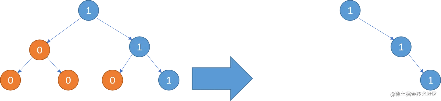 题目(中等):给定一个二叉树 根节点 root ,树的每个节点的值要么是 0,要么是 1。请剪除该二叉树中所有节点的值为 0 的子树。