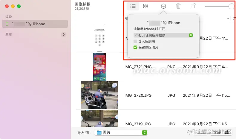 图像捕捉 App 窗口右上角还有一些选项,比如以列表或图标显示照片,导入完成后是否删除iPhone 里的原照片等。
