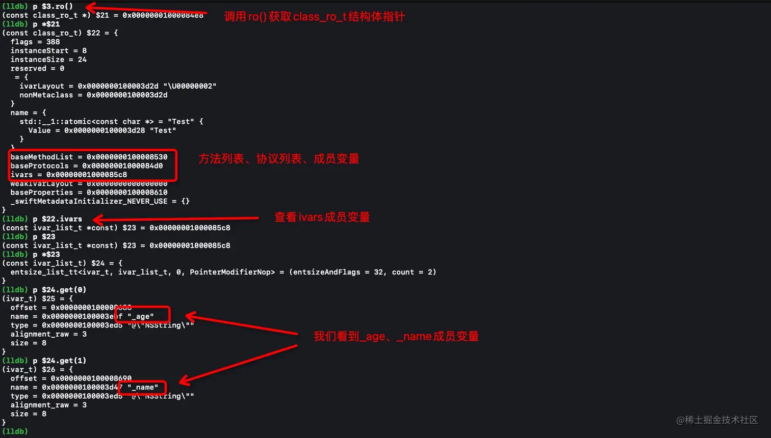 ro()方法会返回一个class_ro_t *的结构体指针,这个结构体中存储这成员变量信息;methods()方法会返回method_array_t存储着方法列表信息;properties()方法返回property_array_t存储着属性列表信息;protocols()返回protocol_array_t存储着协议列表信息;