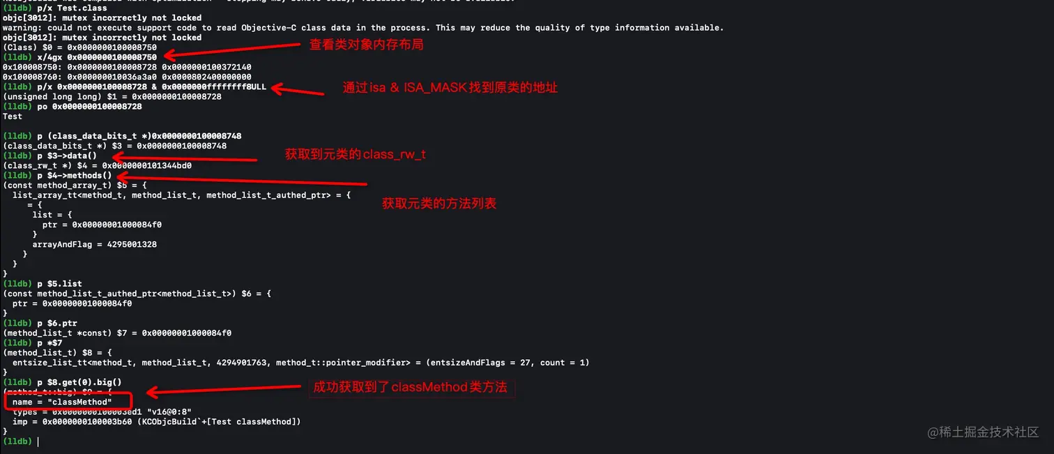 通过class_getClassMethod源码我们可以看到,其内部获取类方法实质是哪传入的类获取了一次元类,在再元类的方法列表中进行查找,所以当传入类时,首先获取到元类,在查找方法,所以返回成功很容易理解。那么为什么传入元类的时候获取类方法也会返回正确呢,这个秘密其实在getMeta()方法中,getMeta()内部其实是有一层判断的,如果传入的类已经是元类了,那么就不会继续获取元类,而是直接返回,那么最终就还是获取当前元类的方法列表了,所以可以查到类方法。