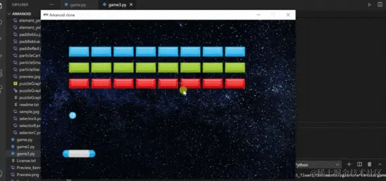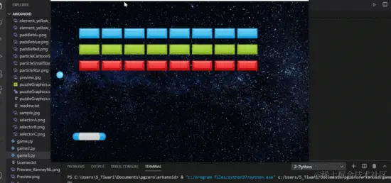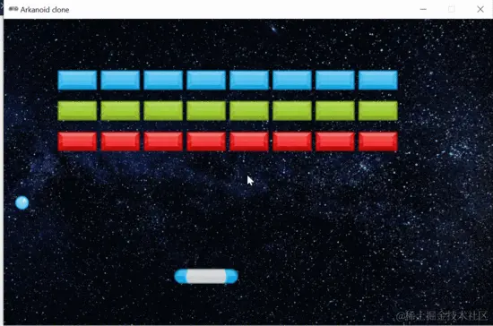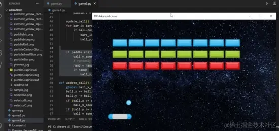 再次,我们检查球是否与桨碰撞,如果是,改变它的y方向。随机改变x方向。