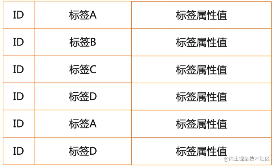 数据类型均退化为字符串类型,适合标签不固定,标签稀疏,允许牺牲部分性能但提高标签定义的灵活度。支持几十到几十万不同标签规模。