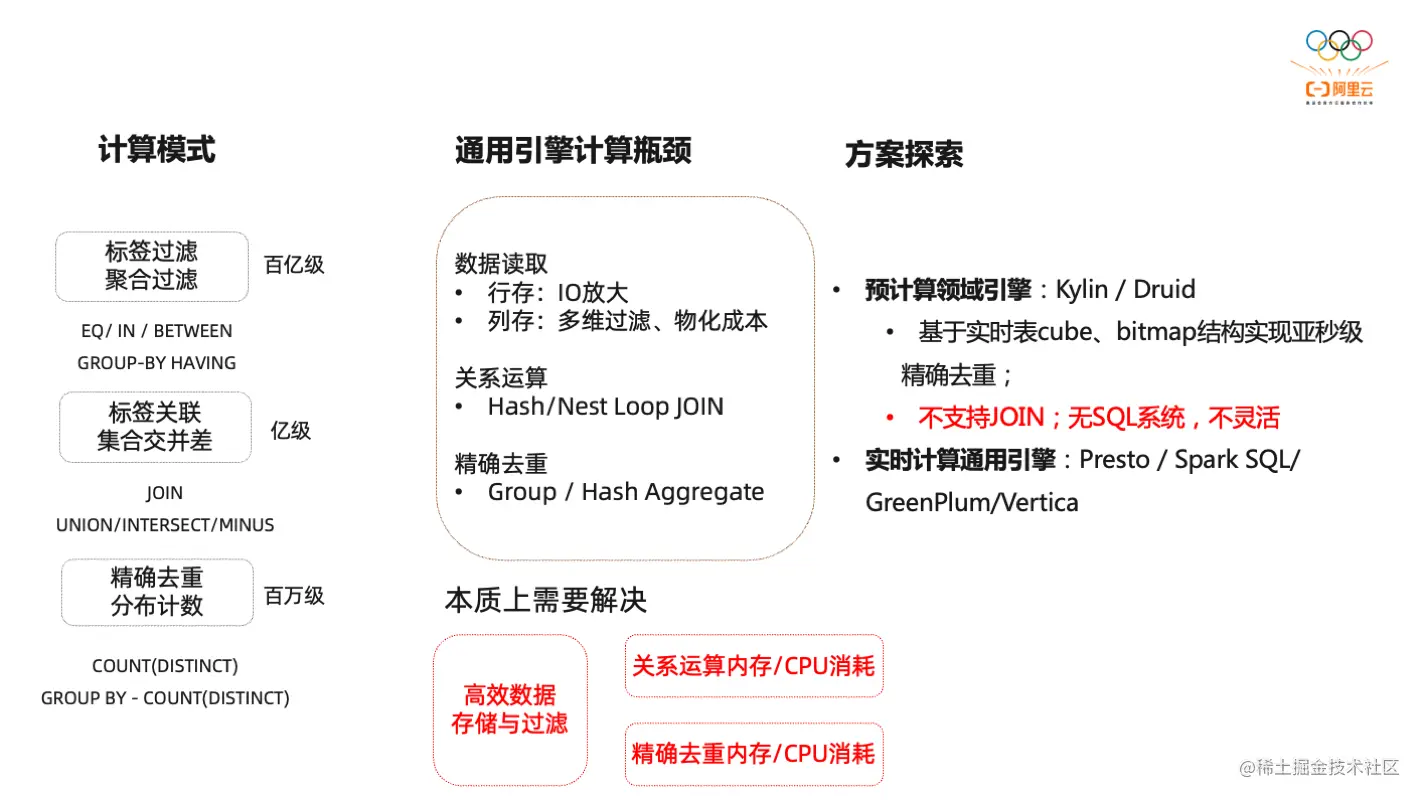 标签过滤分为等值过滤,可以用Equal/In/Between,这些过滤可以在百亿级别上进行操作。操作之后的结果集,要做很多的交差并集,举个常见例子,一个用户既关注了竞品品牌也关注了本公司商品,却没有买,这里面其实有并的关系,有差的关系,有交的关系。所以这些人群关系之间要组合,有很高的交差并集计算。最后还有很强的精确去重的需求,因为最终要把计算结果,变成一个唯一定位用户的ID,这个ID会用来做广告的投递。那这些需求,在引擎层面上就是数据读取效率怎么样,如果用行存读取是不是会出现IO放大的问题,数据按行去存,真正过滤是按照某一列过滤,但是IO读取,会把整行读取,会出现IO放大问题。列存还会有索引问题、过滤效果问题。计算算子上表连接时是Hash JOIN方式还是用Nest Loop JOIN方式。精确去重的效果如何。这些都是对计算引擎效率上有很高的要求。所以本质上是要解决高效数据存储与过滤、关系运算内存/CPU消耗、精确去重内存/CPU消耗问题。