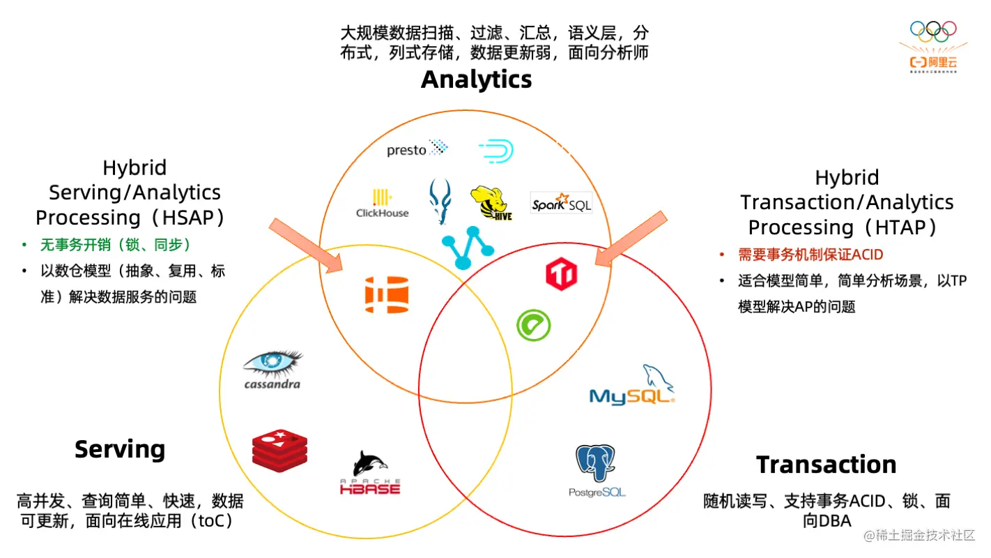在下图左侧部分也是可以做一些创新的,左侧的创新会发现最大的问题是不支持事务。把事务能力弱化,不需要那么多事务,希望查的足够快,更新的足够快。所以这个地方是有可能做技术创新,这个技术既具备很好的灵活的分析能力,也具备很好的数据写入能力,有具备完整的SQL表达能力。所以左侧的交集部分的技术,很适合刚才提到的三点技术要求。这就是今天要分享的产品Hologres。