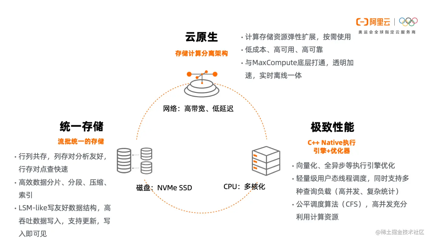 实际上没有神秘的地方,Hologres更多还是依赖于整个IT行业,有很多底层技术上的进步。比如,带宽变宽,延迟变低。好处是之前必须依赖本地的操作,比如之前依赖本地磁盘,现在可以依赖网盘。其实Hologres底层的存储,分多副本存储,高可靠存储,把这些负责状态管理的事情,都交给阿里云,底层是盘古存储引擎,自带多副本,自带压缩,自带缓存,自带高可靠。这就会使整个计算节点的逻辑变的轻薄和简单,也让高可靠更加简单。任何一个节点宕掉之后,可以很快从一个分布式的网盘里恢复状态。会让计算层变的无状态,这是第一点。第二点是磁盘的利用,过去磁盘的转速有机械瓶颈。机械磁盘是按圈去转的,一秒钟多少转。所以我们的IO场景都是面向扫描场景做了大量的优化。我们希望所有的数据都是以块为单位,进行更新、读写。所以在过去这种高更新场景,在整个数仓里很难实现。Hologres是采用SSD设计,固态硬盘支持更好的随机读写能力。这让我们设计存储架构的时可以抛开过去必须依赖于这种扫描场景,去设计整个存储的数据结构。Hologres可以行存也可以列存,分别适应不同的场景,同时也采用log structured merge tree 的方式。支持高吞吐数据的写入和更新的场景。第三个是CPU多核化,CUP的主频已经不会有本质的提升。但是在多核化场景下,如果可以把一CPU内部多个核并行利用起来,就能把CPU资源充分发挥到极致。这就要求对操作系统的底层语言掌握的要比较好,Hologres使用C++实现的数仓。Hologres底层的算子都会用向量化方式重写,尽量发挥多核化并行计算能力,吧计算力发挥到极致。