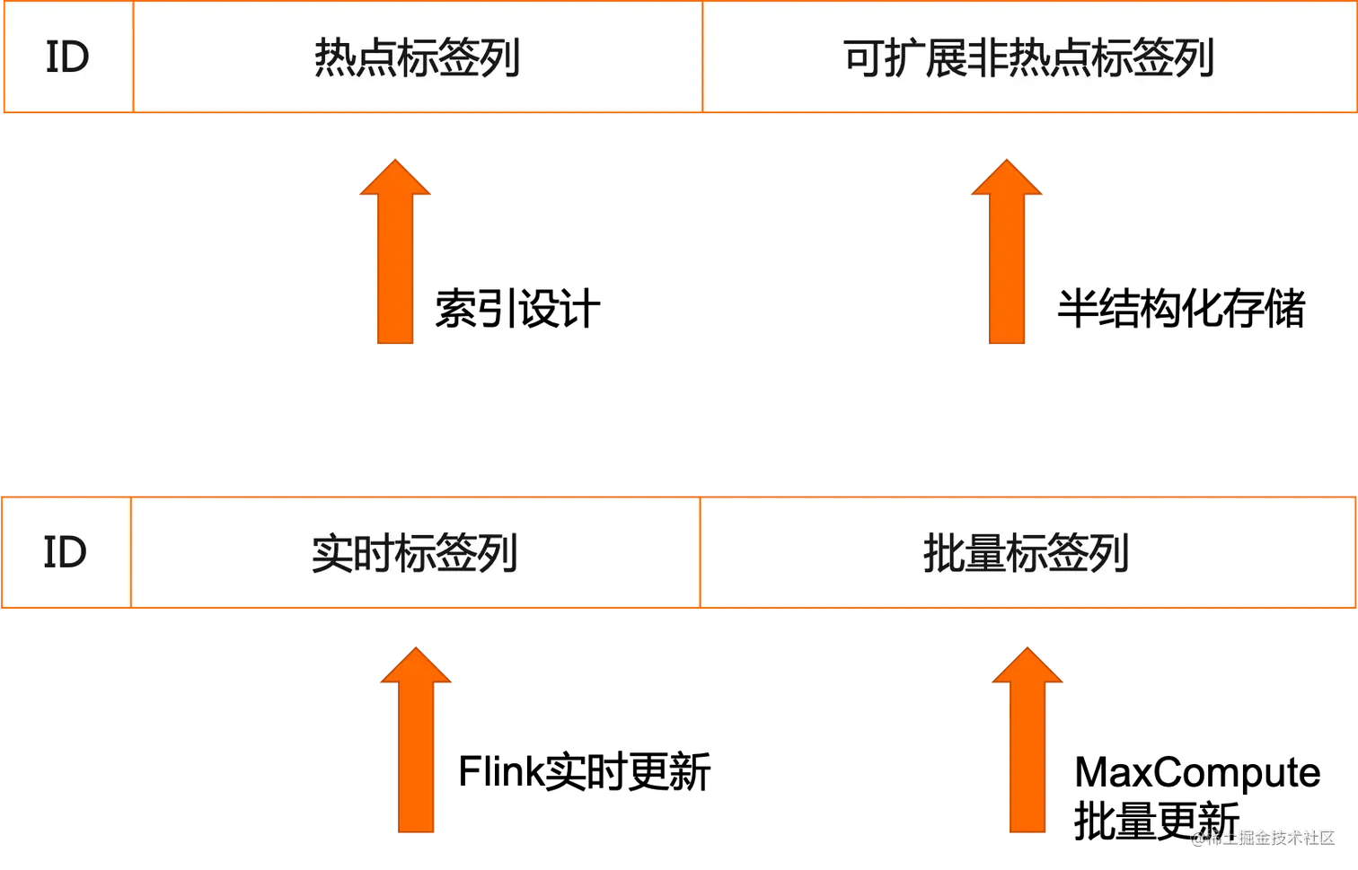 •标签分为实时(Flink)更新和离线(MaxCompute)更新两部分,两部分共享一张表,减少运行时Join,Flink加工实时部分,MaxCompute加工离线部分,在Hologres中合并