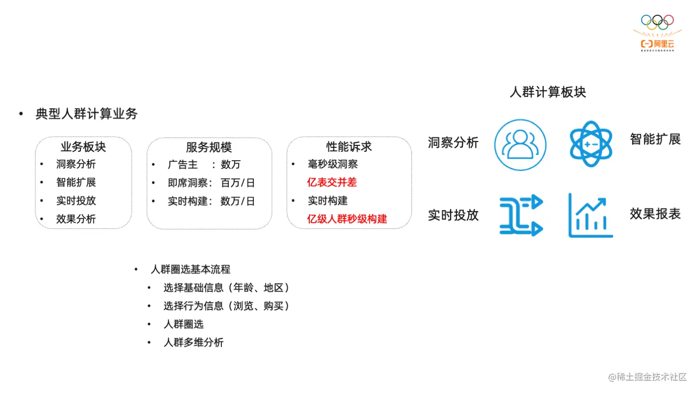 典型人群业务版块的核心是洞察分析,洞察分析一般的场景是,要支撑几万个不同的广告主,他们会在平台上自由选择更感兴趣的人群,每个广告主对人群的诉求是不一样的,某些人关注的购买力,有些关注的是收藏行为。每天数万广告主发出数百万次的查询请求,构建数万次各种人群包,各个系统的计算复杂度是要求非常高的。这里的核心诉求包含几个点,毫秒级洞察,因为所有的查询希望是交互式的,需要在界面上每一次互动,每一次下拉菜单,每一次选择,每一次条件组合,都希望看到一个互动结果,整个人群是变大还是变小,目标人群是不是跟期望的相似。这一点对性能要求是非常大的。同时提醒大家,数据一定要脱敏处理,保护好用户的个人隐私,所有的分析都是建立在合规数据基础之上的分析。