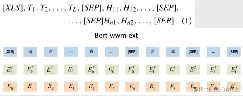 其输入部分包括:问题、列名。同样以前面“大于18岁的学生都有谁”为例,可以看到上图所示,T1至TL,后面跟着的是所提问的表当中所出现的每一列它的列名,比如说这个表当中可能有姓名、学号或者年龄。另外,与bert输入不同的是它用 [XLS]去替换了[CLS]。
