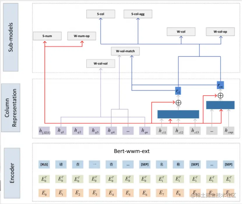 经过上述步骤之后,我们就得到了问题当中,每一个token的表示,以及表格当中每一列的表示。