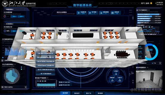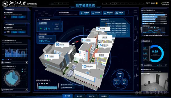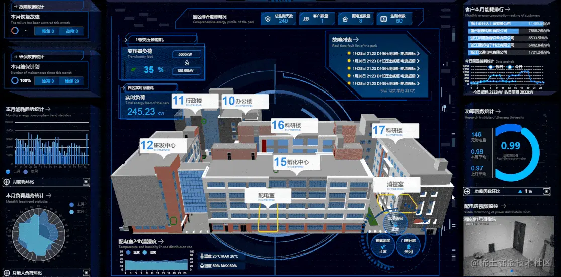为了顺应智慧园区建设需求,通过ThingJS打造了一款三维可视化数字能源系统。通过数字孪生技术,结合三维可视化呈现能力,辅助园区完善能源管理体系,优化能管模式和机制,全面提升园区用能效率和供能服务水平。整合园区各个关键环节的资源,集成了能源、告警、监控等管控场景界面,使各系统之间互联、共享、智慧,实现了多信息协同联动,为园区安全管理、能源全面掌控提供了有力保障。